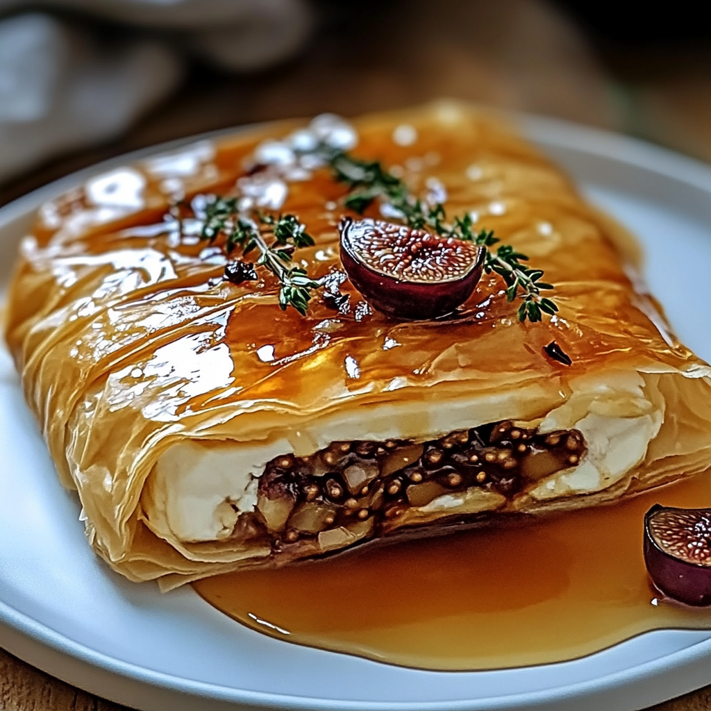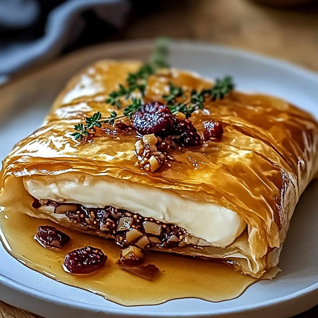 A delicious and elegant appetizer featuring creamy brie cheese wrapped in flaky puff pastry, topped with honey and fig preserves.