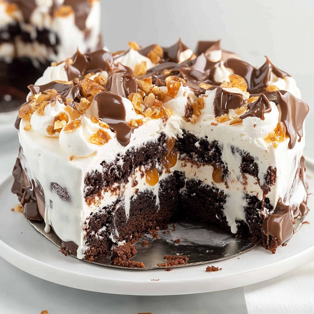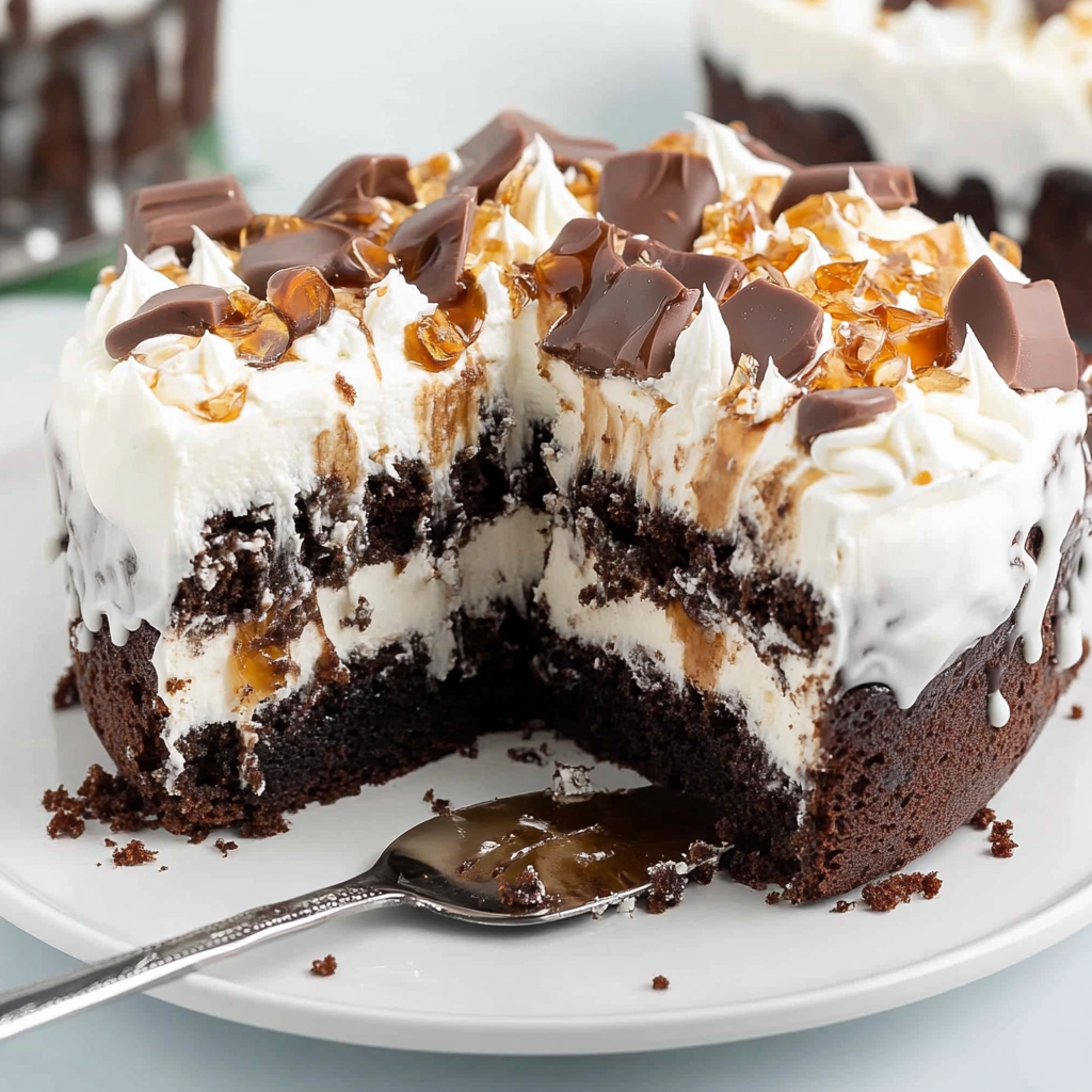 Once chilled, spread Cool Whip on top of your cooled cake. Finally, sprinkle with chopped Heath bars for added crunch and sweetness.