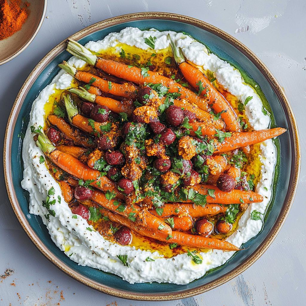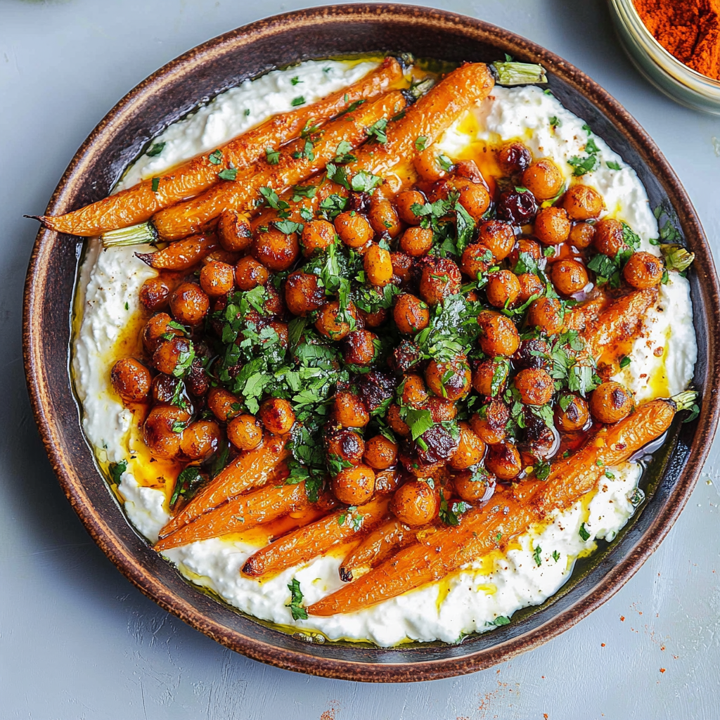 Elevate your dining experience with Honey Harissa Carrots With Whipped Feta, a vibrant dish that harmoniously blends sweet roasted carrots with a spicy harissa glaze, all resting on a creamy whipped feta base. Perfect for any occasion—from dinner parties to casual meals—this recipe offers a delightful explosion of flavors and textures. The combination of honey and harissa creates a tantalizing sweet-spicy kick, while the whipped feta adds a rich creaminess that perfectly complements the dish. Quick to prepare in just about an hour, this nutritious offering is not only visually stunning but also packed with healthy ingredients like carrots and protein-rich chickpeas. Serve it warm with bread for dipping or as an eye-catching starter that will impress your guests.